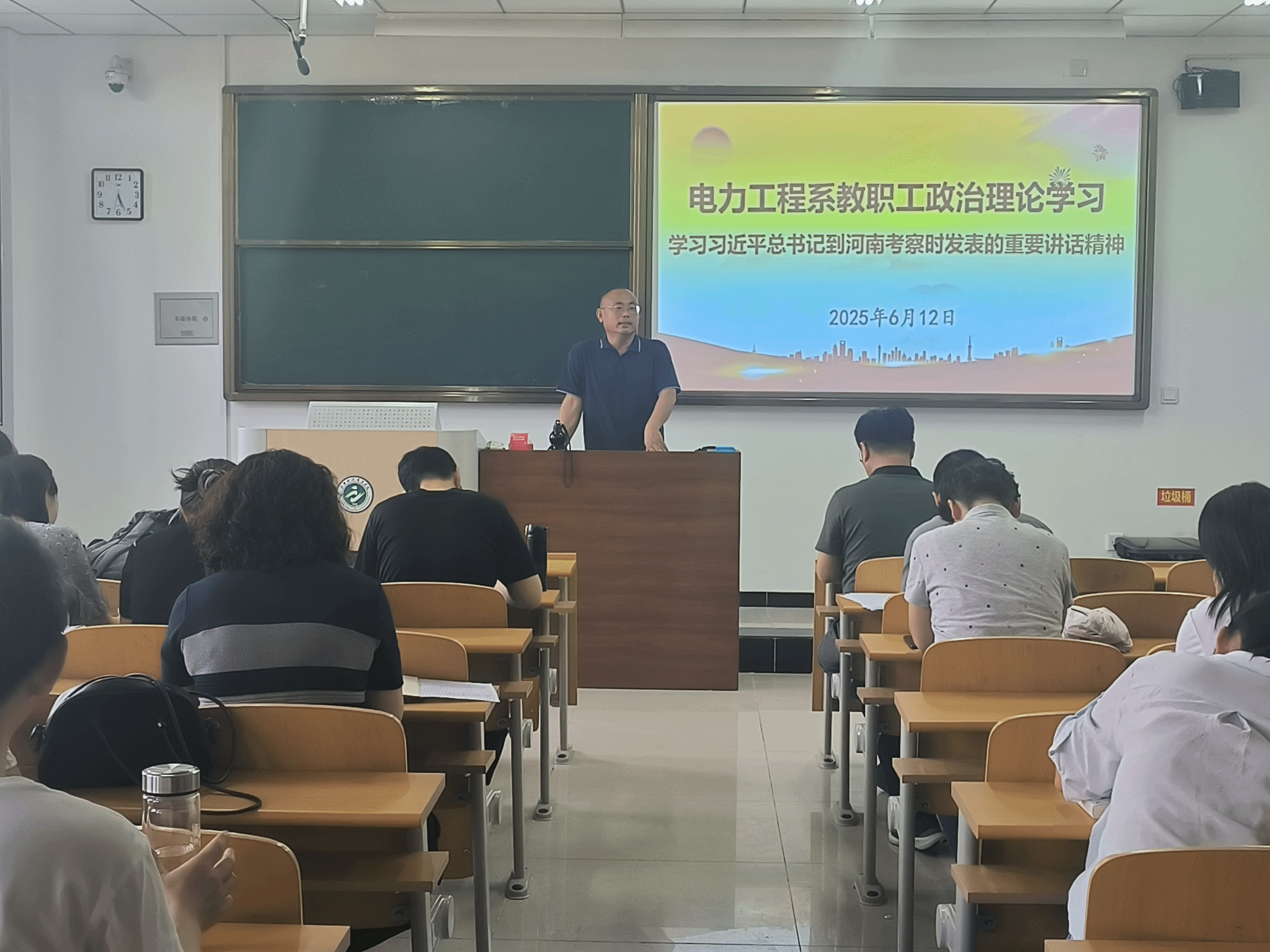 为深刻领会习近平总书记重要讲话精神,6月12日下午,电力工程系开展教职工政治理论学习活动,深入学习习近平总书记在河南考察时的重要讲话精神。会议由系党委书记陈元才主持,全体教职工参加。