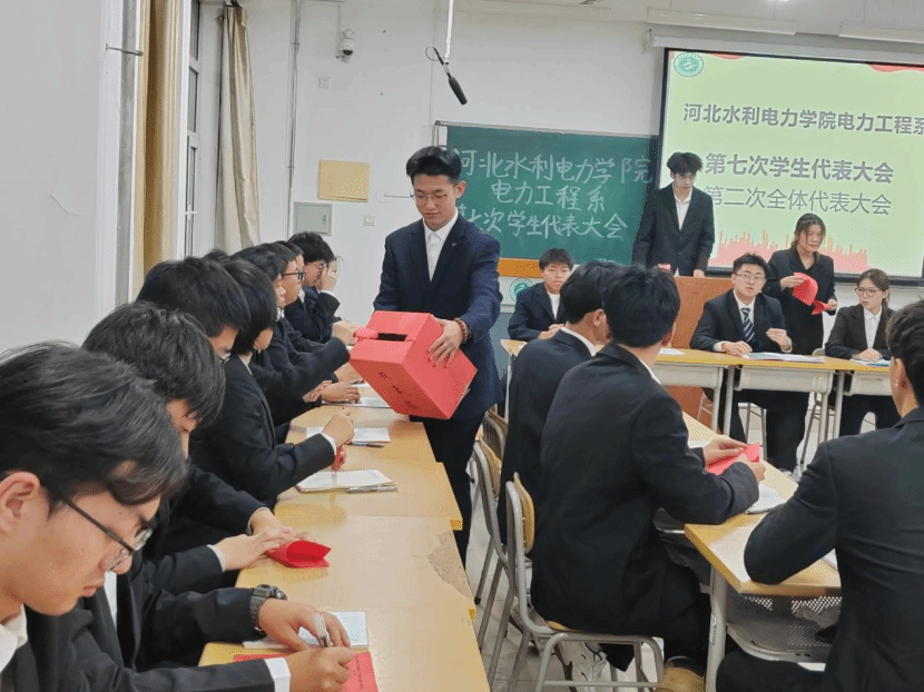 第二次全体代表大会上,经过参会代表审议,一致通过了大会选举办法和候选人名单,并对候选人的基本信息进行了介绍。最终以投票方式选举产生了河北水利电力学院电力工程系第七届学生委员会委员、第七届学生会主席团成员及出席河北水利电力学院第七次学生代表大会的代表。