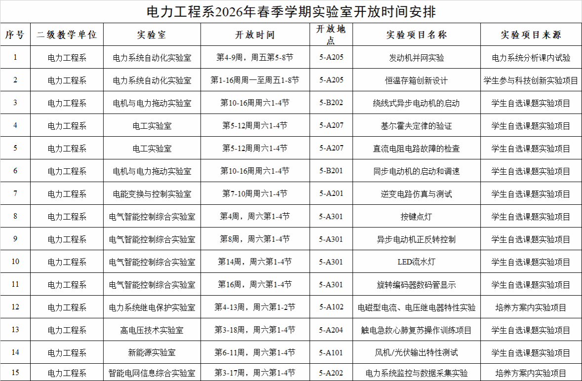 电力工程系2026春季学期实验开放项目及时间安排参见下表。开放实验项目的预约和调整,会及时由教学信息发布群通知。欢迎各位同学积极报名参加!
