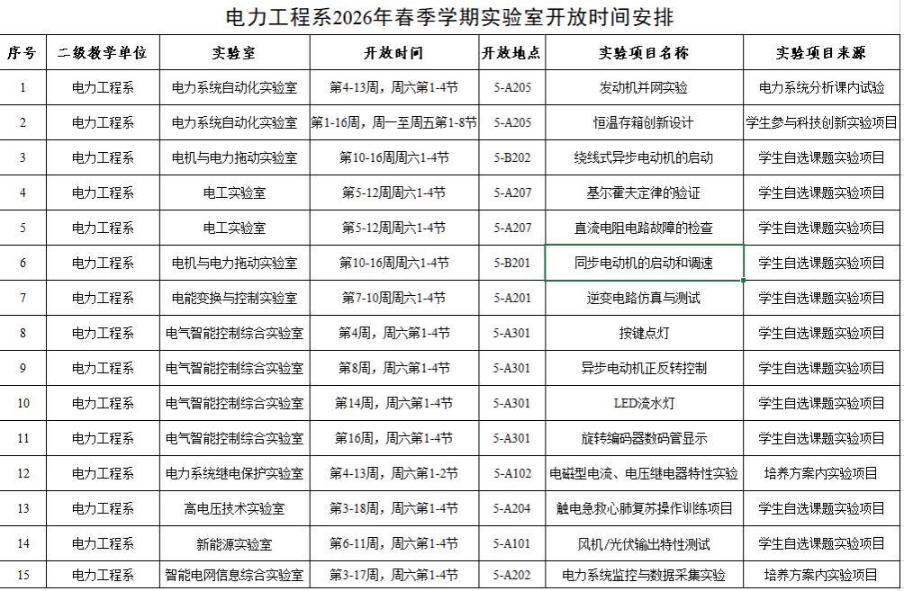 电力工程系2026春季学期实验开放项目及时间安排参见下表。开放实验项目的预约和调整,会及时由教学信息发布群通知。欢迎各位同学积极报名参加!